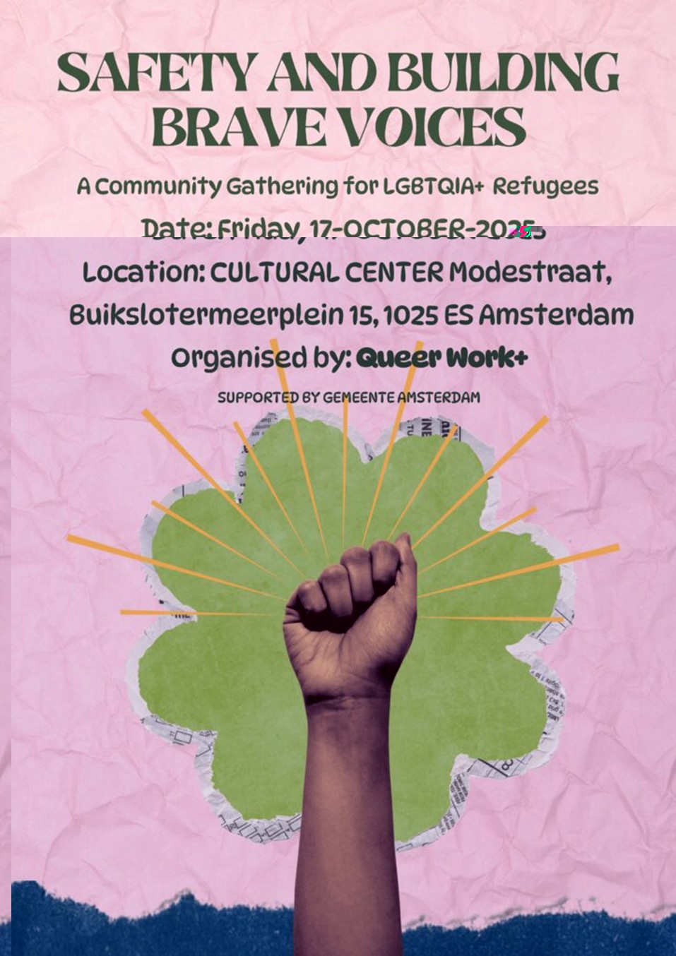 Evenement/queer vluchtelingen. De nieuwe bijeenkomst Safety and Building Brave Voices – A Community Gathering for LGBTQIA+ Refugees, georganiseerd door o.a. Queer Work (empowerment voor queer vluchtelingen), draait om precies dat: veiligheid, verbinding en zelfexpressie.